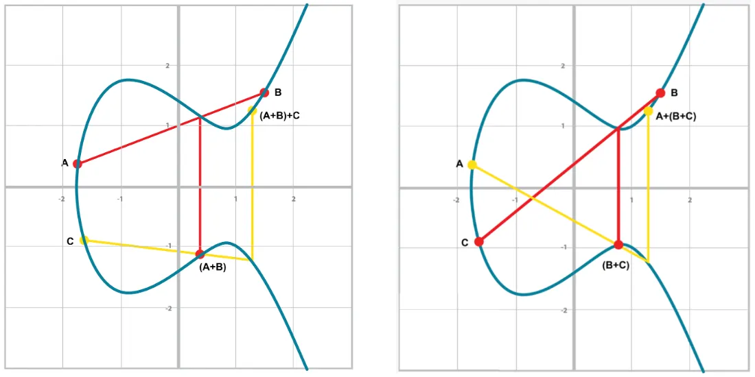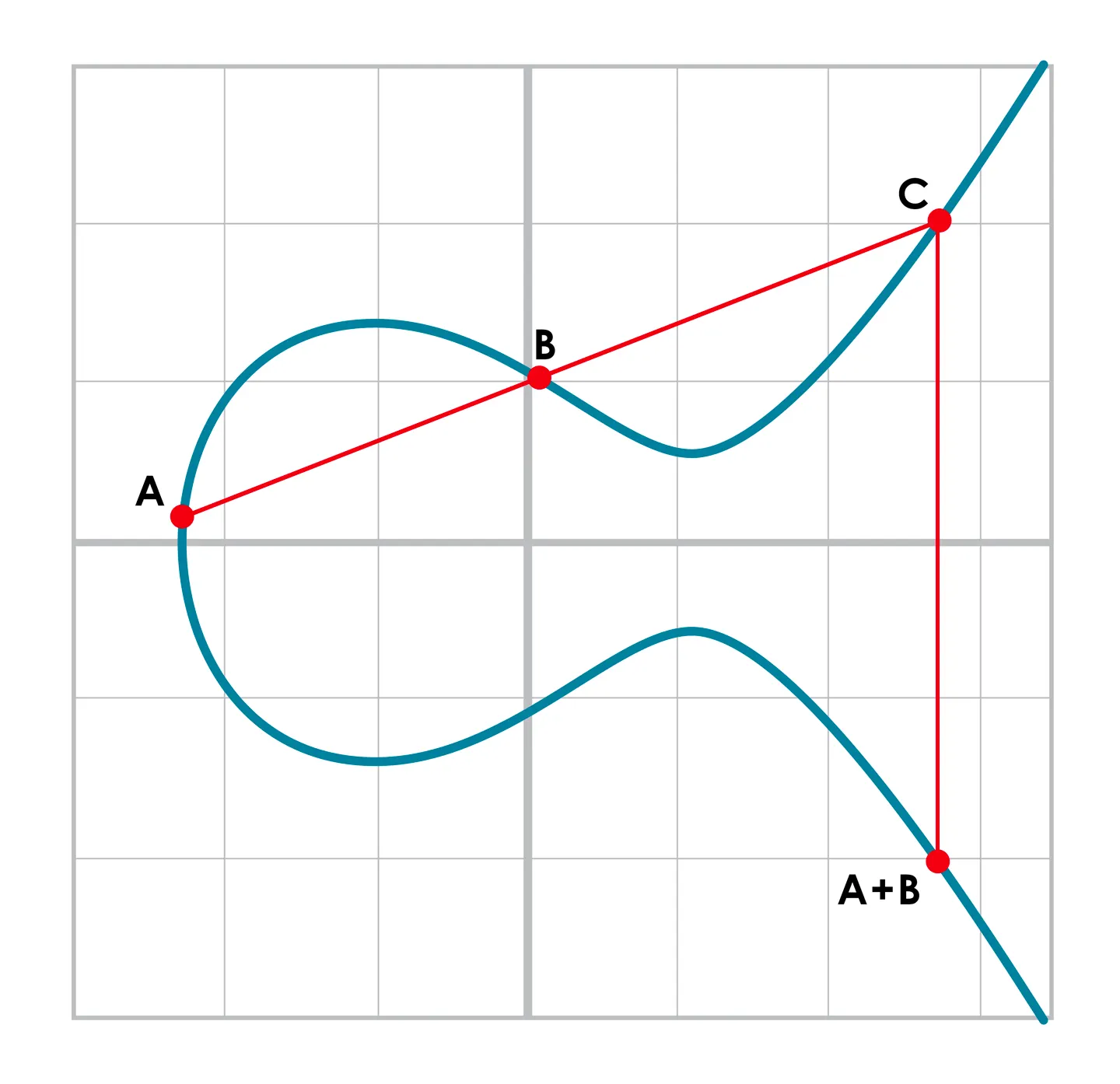 덧셈은 타원곡선의 두 점을 지나는 직선이 만나는 다른 접점을 x축으로 대칭시킨 점으로 정의한다.