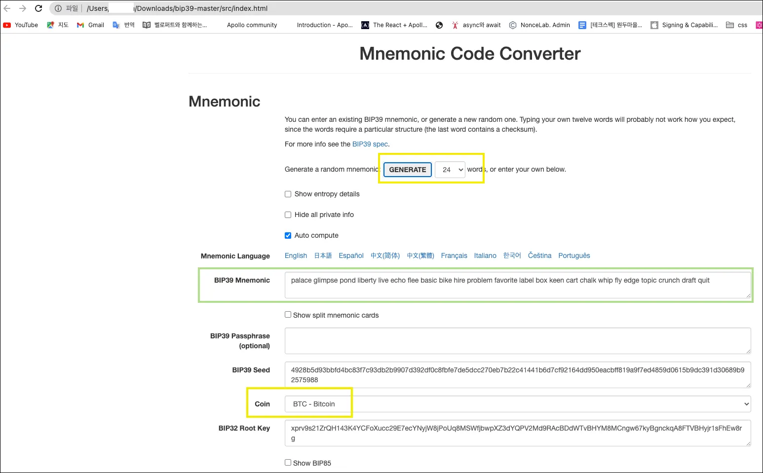 오픈소스를 활용하여 24자리 니모닉 비트코인 지갑을 생성한다.