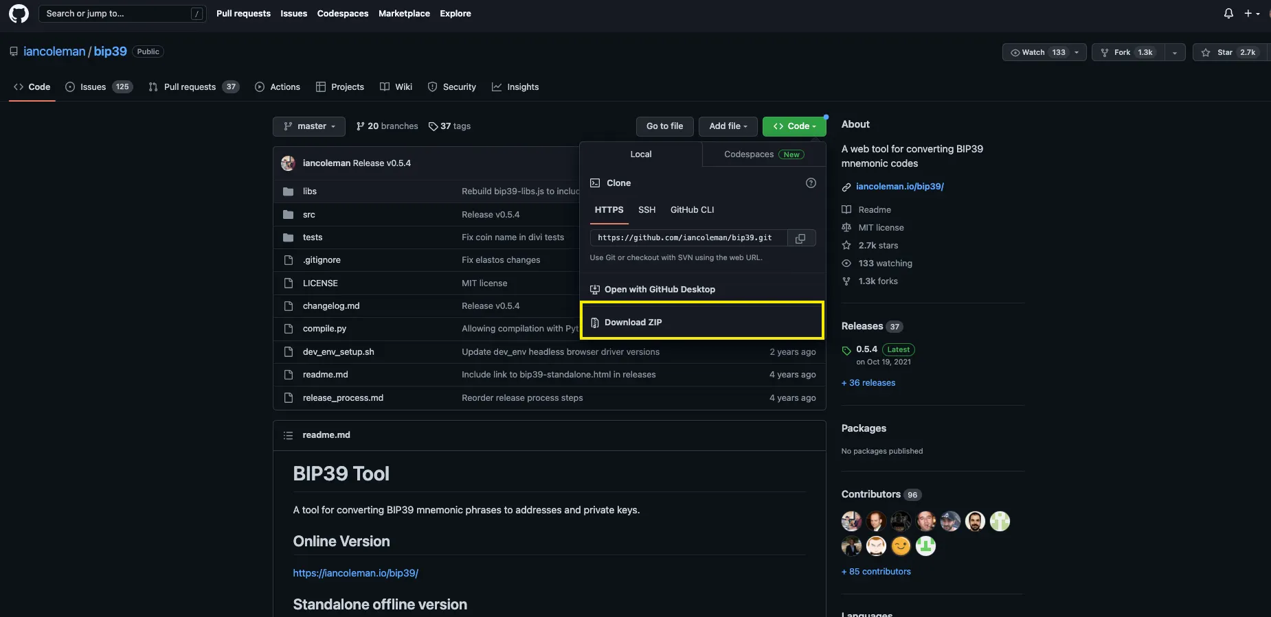 위 사이트에서 바로 생성할 수 있지만 네트워크와 연결된 상태에서 니모닉을 생성하는 상황을 피하기 위해 직접 위 사이트 코드를 다운받아서 만들기로 한다. 어려운 과정이 아니므로 누구나 쉽게 따라올 수 있다.